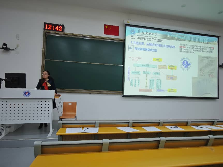 会议在国歌声中拉开帷幕。根据机关二分工会五年汇报工作安排,2026年二级教代会的汇报单位为资产经营公司、研究生院。资产经营公司执行董事、总经理金海燕、研究生院正处级组织员张磊分别作了2025年度工作报告,总结了2025年部门的工作情况,包括重大事项、计划完成情况,并对2026年工作做出了展望。2026年是学校“十五五”规划的开局之年,也是学校全面落实第三次党代会决策部署、聚力建设“能源电力特色世界一流大学”的起步之年。