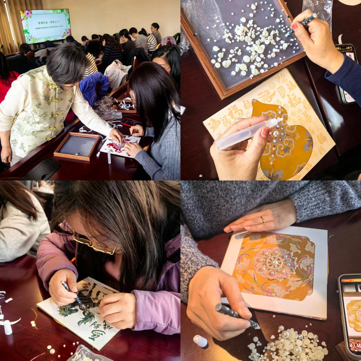 白静在活动现场与职工们亲切互动,不仅提前熟悉了宋锦珍珠画的制作流程,还亲手为大家演示关键步骤:从宋锦底料的平整固定、珍珠点位的精准标记,到点胶的用量控制、不同大小珍珠的搭配摆放,每一个细节都讲解得细致入微。遇到职工对点位布局有疑问、点胶手法不熟练的情况,她耐心上前手把手指导,逐一纠正操作中的小问题,鼓励大家大胆发挥创意,根据自己的喜好调整珍珠排列样式。在她的细致引导下,原本略显生疏的职工们逐渐找到手感,创作热情愈发高涨。