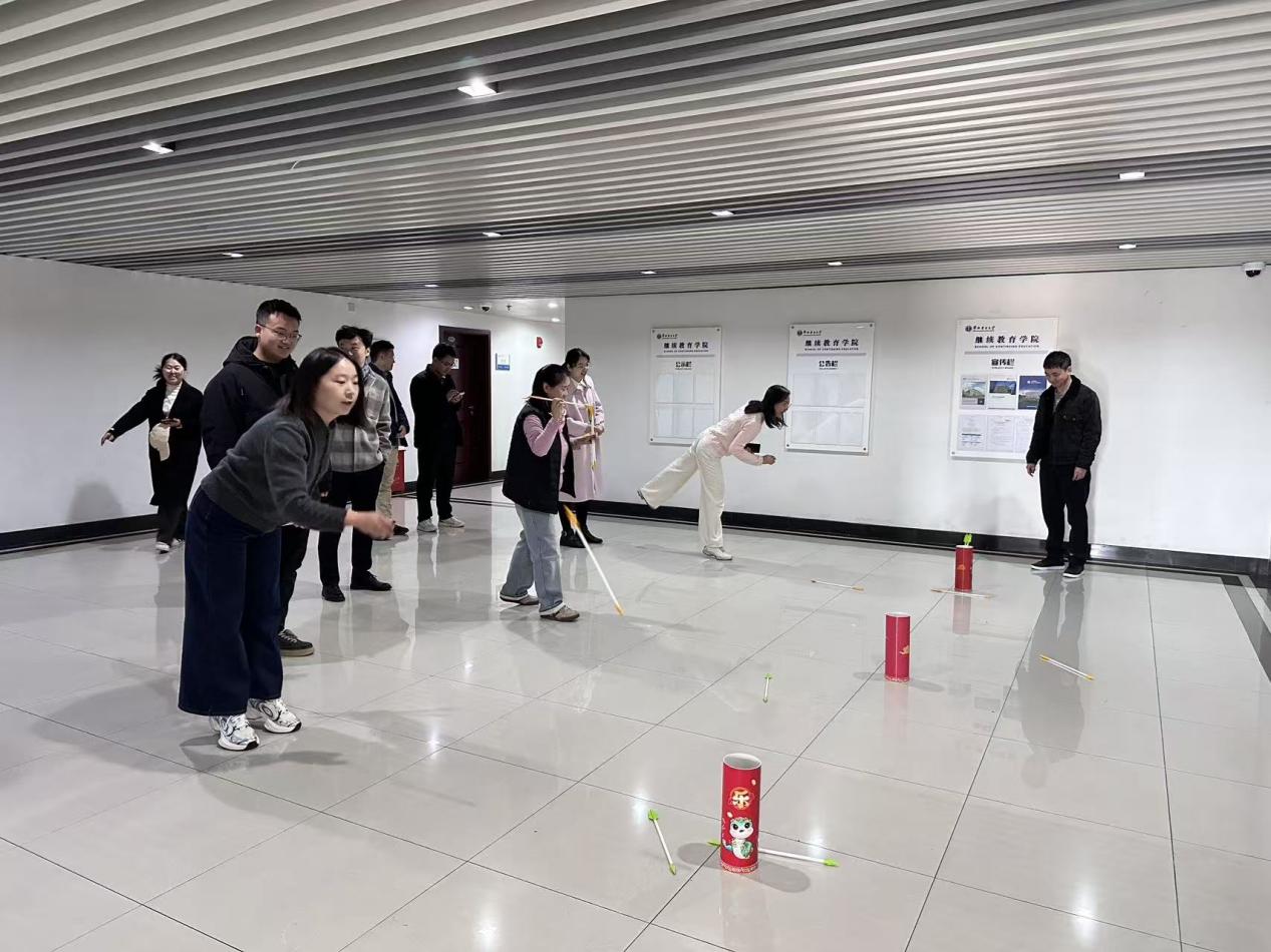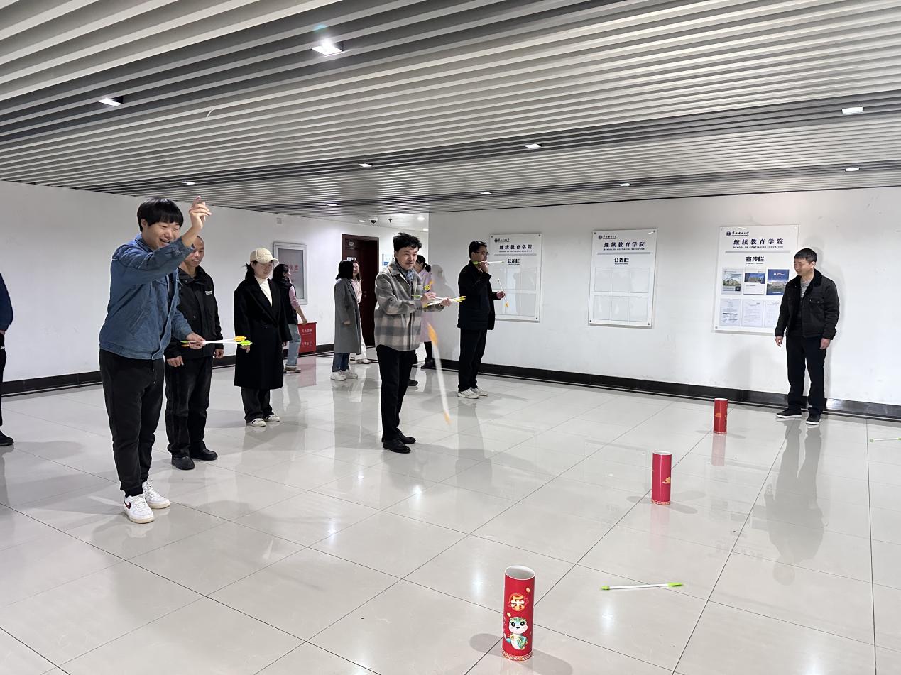 比赛开始前,大家纷纷摩拳擦掌,加紧练习。比赛过程中,教职工们纷纷化身“投壶高手”,展现出优雅与创意并存的投掷技巧,或抬臂屈肘,目光紧盯壶口;或屏息凝气、丈量目测;或松弛臂膀、抖腕轻掷,一系列动作干脆利落,展现非凡的专注力与精准度。大家热情高涨,或赢得掌声,或开心一笑,无论投中与否,都在过程中享受到片刻轻松愉悦。