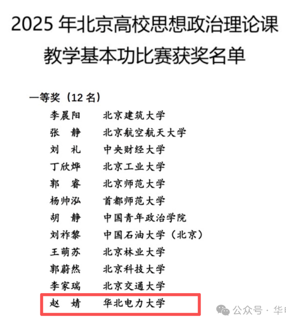 为进一步深入学习贯彻习近平总书记关于思政课建设的系列重要论述,纵深推进北京高校思政课建设内涵式发展,2025年10-11月,中共北京市委教育工作委员会举办2025年北京高校思想政治理论课教学基本功比赛,我校马克思主义学院青年教师赵婧荣获一等奖。