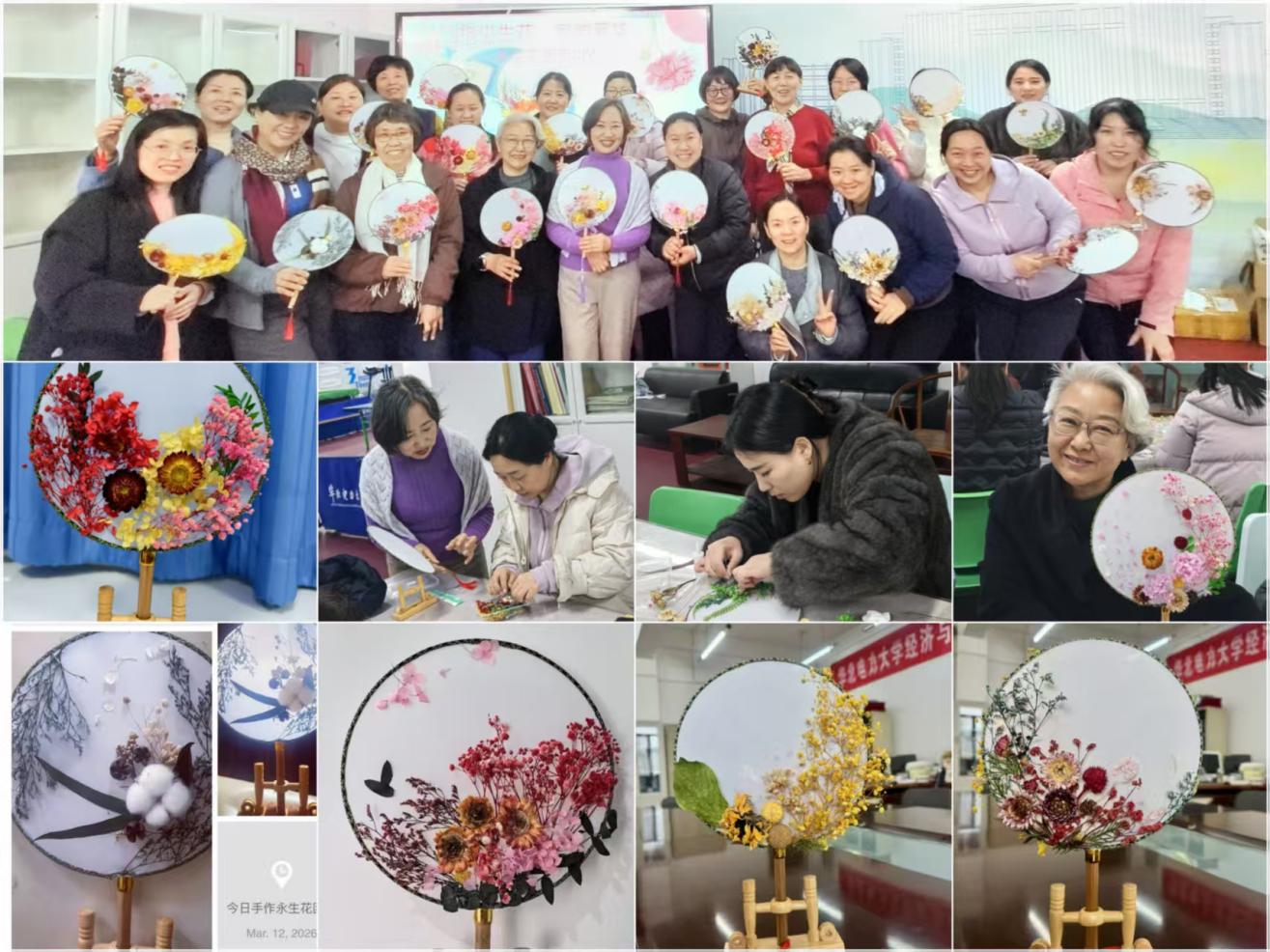 经过一番精心创作,每一位参与老师都收获了属于自己的专属手作作品。一把把雅致的永生花团扇,将春日的浪漫与女性的温婉完美融合;一个个精巧的宋锦小马,承载着非遗的底蕴与节日的祝福。老师们手捧自己的作品合影留念,脸上洋溢着满足与喜悦,定格下这个春日里最温暖的瞬间。